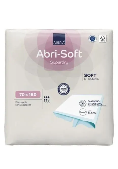 Abri Bed Sheets with Tuck-ins are disposable bed pads designed for optimal protection and convenience in incontinence care or wound rinsing. Each pack contains 30 sheets (60 per carton), featuring a superabsorbent gel with a capacity of 1750ml for fast fluid absorption. The embossed channels ensure efficient fluid distribution, while the non-woven top layer offers dryness and comfort.