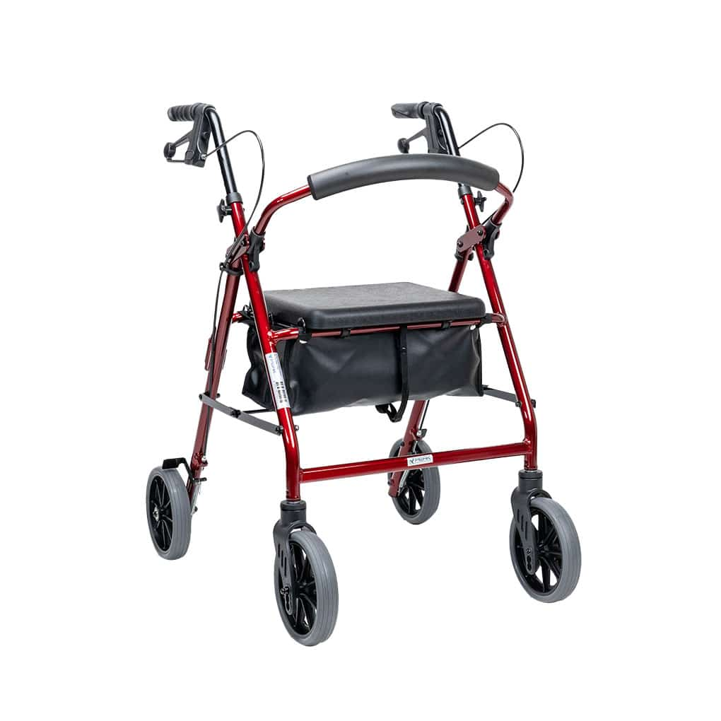 A sturdy 4-wheel rollator with 8″ wheels suitable for rougher terrain than home and care facility use. Ideal for use in gardens or on rough roads and lanes