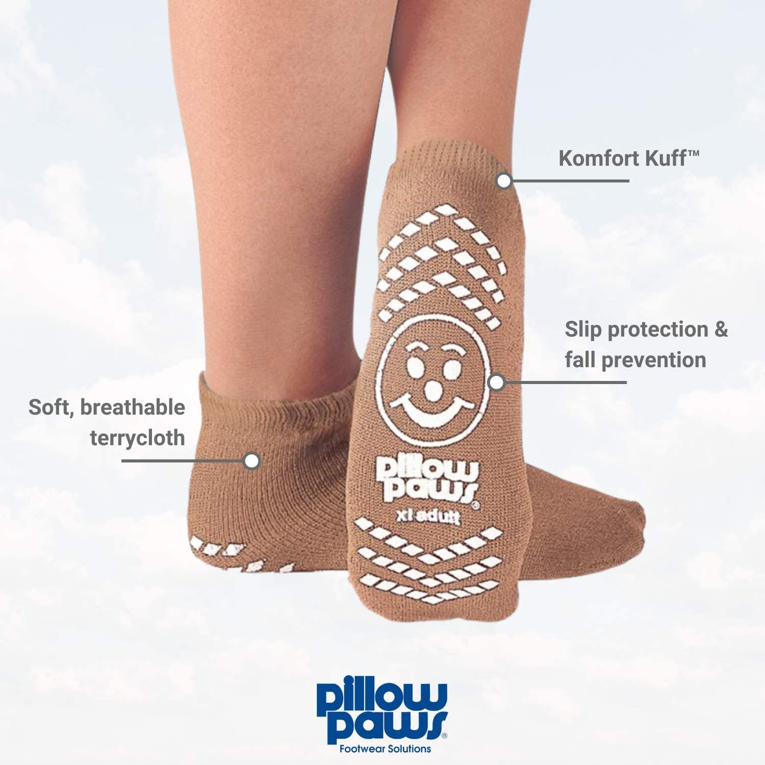 Pillow Paws are patient safety socks with 360-degree wrap around slip-resistant tread design, made with terrycloth fabric, and machine washable. They provide comfort and increase confidence for those with mobility issues.