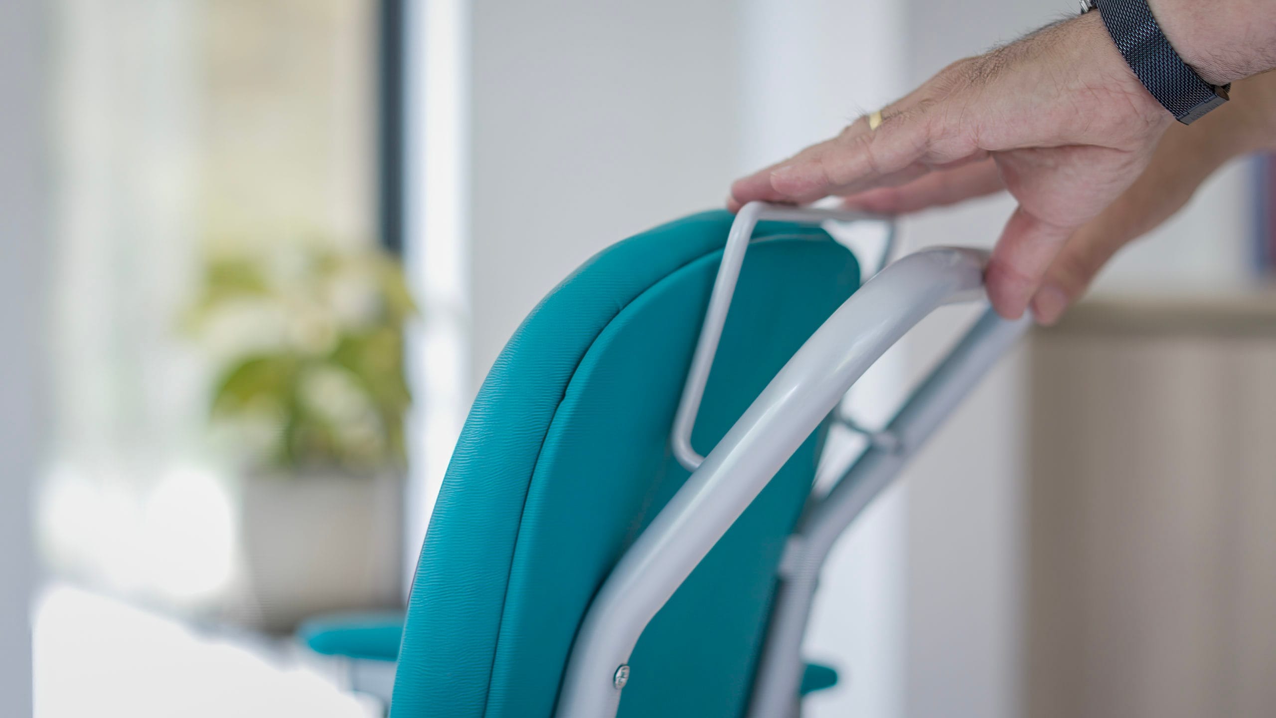 A mobile dining chair with dual controls specifically tailored for User or Carer, fitted with locking castors to ensure the chair remains in a secure location that’s coupled with an easy release control for moving. Suitable for extended seating with lift-up arms for side entry/exit.