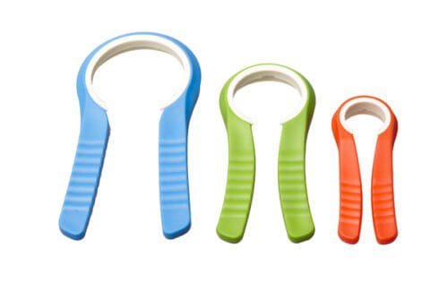 The Zeta Jar, Bottle, and Tap Turners are a set of three ergonomic covers designed to make it easier to open jars, bottles, and taps. Made of lightweight molded plastic with pliable inner rings, these turners require minimal grip and come in bright colors for easy identification.